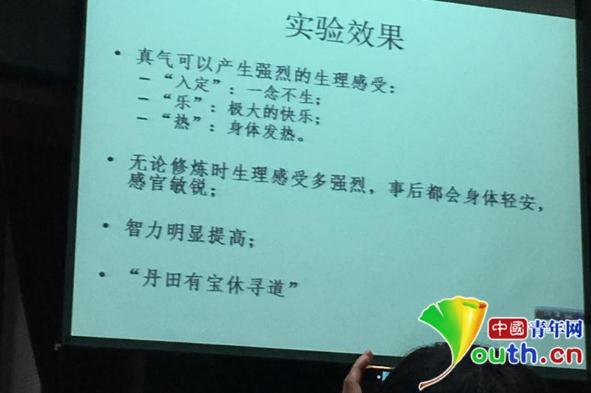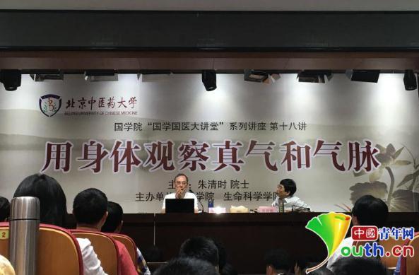 朱清時展示自己的實驗效果。中國青年網 圖在持續(xù)了90分鐘的講座中,朱清時的核心論點是,“用自己的身體來做的一個實驗,初步結果表明,中醫(yī)的真氣和經絡是可能存在的,但需要用新的方法來研究?!?